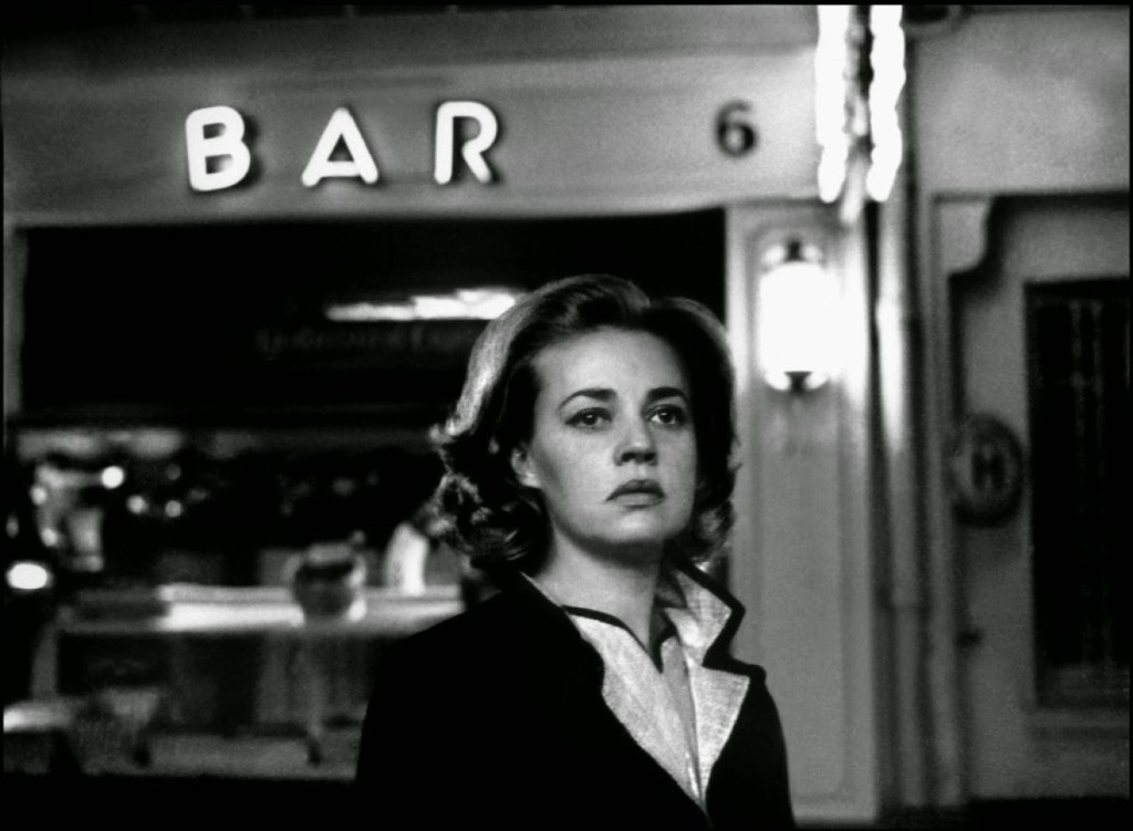 When the waiting Florence sees Julien’s car passing by, she mistakenly thinks he has run off with Veronique and left her behind. Devastated, she returns to her table, and in an extended close up we listen in on her thoughts as she contemplates the implications of the new turn of events. This moment of introspection signals a change of mood: as night falls, the pace slows, and Miles Davis’s melancholy trumpet sets the tone, as cinematographer Henri Decae brilliantly conjures up the atmosphere of Paris after dark.