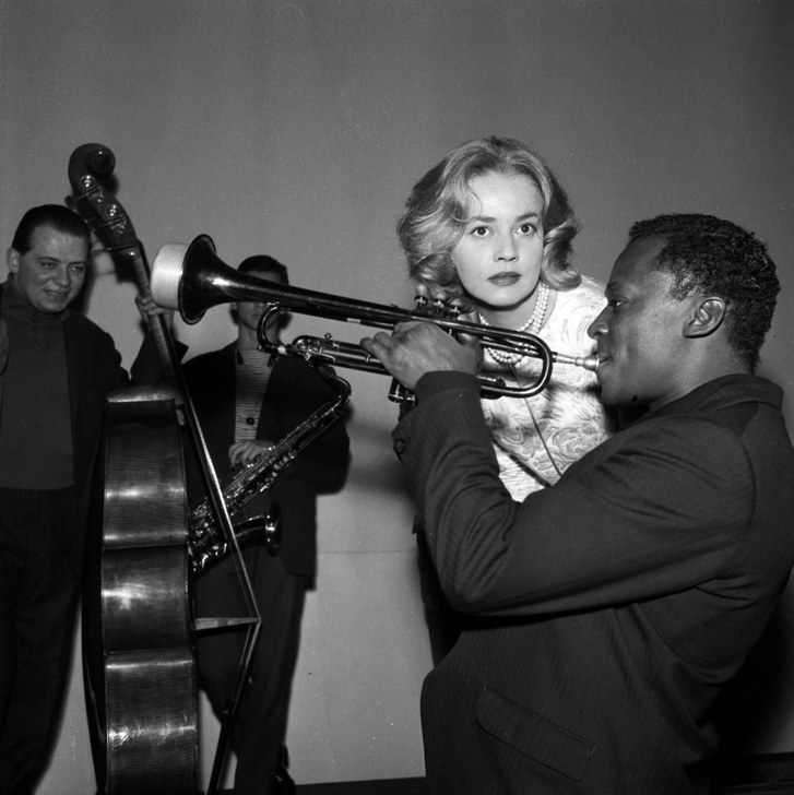 Malle had been a devoted jazz fan since his early teens. His student film Crazeologie had featured Charlie Parker’s song of the same name, and at the time of making Ascenseur pour l’échafaud he was captivated by the music of Miles Davis. By coincidence, Davis came to Paris to play in a club for a short engagement while Malle was editing the film, and through his friend, the writer and musician Boris Vian, Malle arranged to meet with Davis to discuss the possibility that he compose the soundtrack for the film. At first Davis was reluctant, because he didn’t have his usual musicians with him, however Malle persevered and managed to convince him to undertake the project. He showed Davis the film twice and they agreed on the parts where they felt music was needed. Taking advantage of the one night off Davis had from the club where he was performing; Malle rented a sound studio, and here, Davis, drummer Kenny Clarke, and three French session players worked from ten at night until five the next morning, improvising the whole score in one night.