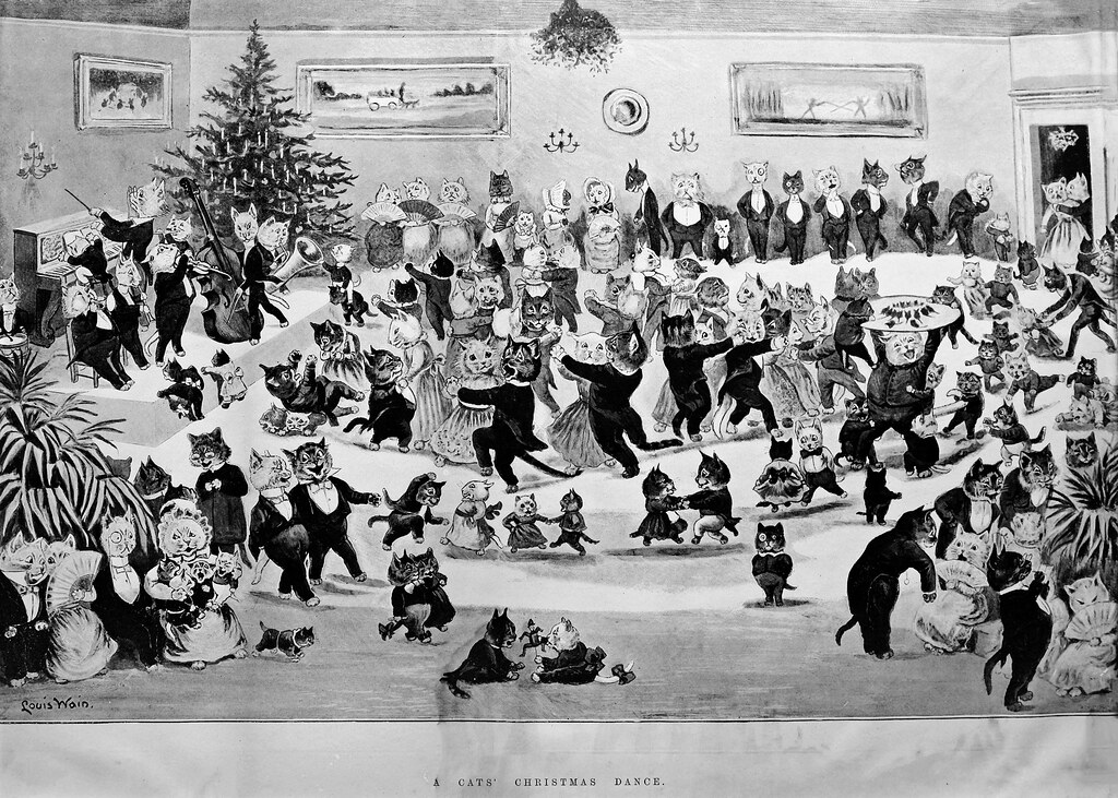 Although Louis continued producing drawings for Sir William Ingram’s Illustrated London News through 1888 and 1889, the anthropomorphized cats for which he became best known did not appear until the Christmas issue of 1890, when the Cats’ Christmas Dance and A Cat’s Party were published. In these two illustrations the cats are pictured wearing elegant evening dress, dancing on their hind legs, and playing musical instruments. The classic humanized ‘Louis Wain cat’ had been born at last.